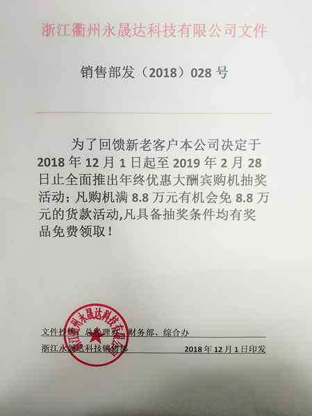 • 永晟達年終優(yōu)惠大酬賓抽獎活動,感恩回饋新老客戶!2018-11-20